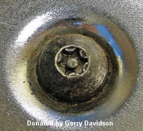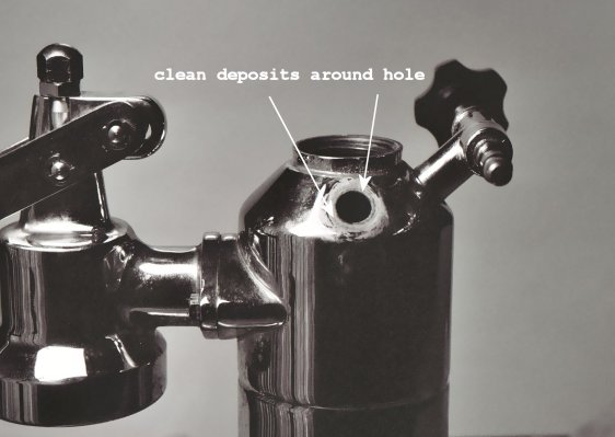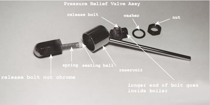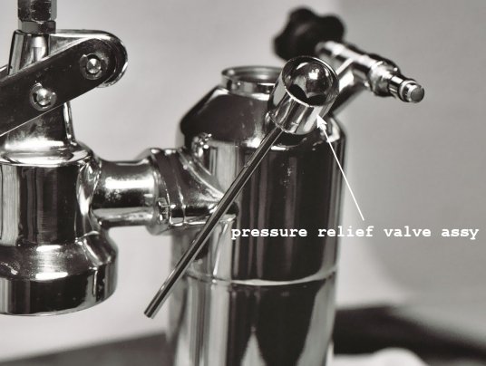 Deposits around the pressure relief valve near the boiler indicate a loose fit probably due to a loose nut. This may have been caused by trying to remove the chrome nut of the valve assy without holding a wrench on the nut below the reservoir or maybe by dropping the machine. I recommend taking off the whole assembly. Sorry, the heating element must be removed to do this repair. Unfortunately none of my 5/8" (16MM) wrench's could fit under the reservoir because they were too thick. I bought a cheap 5/8" wrench and ground down the wrench tip so it would fit under the reservoir and around the nut; Pavoni refers to it as a relief bolt. I used a belt sander with a 60 grit-sanding belt. If you don't have a belt sander, borrow one from one of your friends. I had to grind my wrench down to approx. 3/16" at the tip. Just grind yours down so it can fit around the nut (bolt). You could luck out and have a wrench that fits under the reservoir otherwise your going to grind a wrench. Another option is to go to a bicycle shop and buy a cone spanner wrench. They are made from flat stock and should fit easily under the reservoir. The first step after making up your special wrench is to remove the pressure relief valve portion that is outside the boiler. Hold your wrench on the nut (bolt) below the reservoir and place a 5/8" (16MM) socket on the chrome nut that fits inside the reservoir. Turn counterclockwise and unscrew the chrome nut. Inside the chrome nut is a spring and a seating ball. Different machines may have a different seating component. Mine is made out of a plastic type material that one end is rounded and the other end fits into the spring. Some machines have a round steel ball. Remove the chrome nut, spring, and seating component, and reservoir. Now you just have the nut (bolt) remaining on the outside of the machine. Now comes the lousy part. Empty the water out of the boiler. Remove the base and unhook the wires on the heating element. Make sure you make up a drawing on the wiring configuration. Note the relationship of the heating element to the brass retaining ring. Take a felt pen and place a mark on the element and on the retaining ring opposite each other. This way, the element will be in the original position when you reinstall it. Unbolt the heating element. Now you need a 5/8" (16MM) socket, universal fitting, a straight extension, and ratchet to hold onto the nut inside the boiler. Make sure you locate the correct nut. There is another nut that holds the steam tee fitting in place. While holding the nut inside the boiler unscrew the nut (bolt) from the outside turning counterclockwise. Once the nut (bolt) is unscrewed, place all the components in some white vinegar to clean them up. Clean any deposits from the seating surfaces both inside and outside the boiler hole. Soak a paper towel in some vinegar and place it over the hole. If the deposits have been there for a while, you may have to scrape some of them off. Be careful not to scratch the chrome or gouge the seating surface around the hole. You could use some 0000 (super fine) steel wool in helping to remove the deposits. Once you clean up all of the components you can reinstall the assy. This is the time to look for any problems with washers, etc. that may have been the cause of the initial problem. Getting the nut and washer in place under the hole was a little frustrating. I inserted a small screwdriver into the boiler hole. I put the washer and nut on my finger and then by going down the boiler knob hole, I slid the washer and nut onto the screwdriver. Then I held my finger on the end of the screwdriver. I slowly withdrew the screwdriver back out of the hole while keeping my finger on the tip of the screwdriver. Now the washer and nut should be directly under the hole. Hold them in place with your finger and screw on the longer end of the bolt into the boiler hole. Screw on hand tight and then use your socket to hold the nut from inside the boiler and tighten it from the outside, turning clockwise. Don't torque it down, just snug it up. Now place the reservoir onto the bolt. Place the spring and seating component inside the chrome nut. Slowly place the chrome nut over the bolt and insuring that the seating component is in contact with the beveled hole in the bolt. Screw on hand tight. Place your special wrench under the reservoir and onto the nut (bolt). Use a 5/8" (16MM) socket on the chrome nut and tighten clockwise. Remember, just snug it up! Reinstall the heating element. See Seal Replacement (Replacing the Heating Element) for details on reinstalling the heating element.