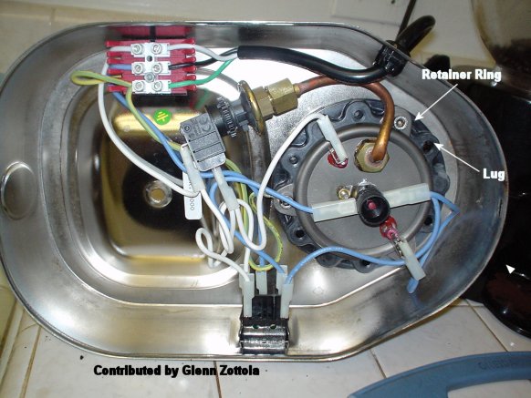 NOTE: This method of tightening the ring from below doesn't work exactly the same on the machines that were built after 1997. Pressure stats are now added to the Europiccola models. The brass retainer ring (flange) is now plastic. The plastic retainer ring (flange) has sealant on it between the base and flange. Look at an angle and you can see the sealant between the flange and base. Make sure you empty the boiler of any water. Make a diagram on how everything is orientated or if you have a digital camera take a picture. You have to get the heating element back into the original position. The main concern here is to be careful that you don't bend the brass tube attached to the heating element. You have to get that tube attached to the pressure stat in the original position. You should disconnect the pressure stat at the tube connection not at the heating element. You'll need a couple of wrenches to undo the connection. Hold one wrench on the pressure stat brass flange and turn the other brass tube fitting counterclockwise to unscrew the fitting. Undo the wiring and remove the heating element from the retainer ring. The reason that you have to remove the boiler is that the gasket between the boiler and base has deteriorated and allowed the boiler to turn or the retainer ring itself has been deformed due to the heat. You'll probably have to purchase new gaskets, both boiler and heating element. You could try to add a new gasket or gaskets, screw the boiler back down and see how everything lines up. It would seem logical that it would but in the real world it probably won't so then you'll have to remove the retainer ring. Take your time to remove the ring. It may take a while to get the ring loose. I would make some marks on the base of the machine with a felt pen to designate where the threaded insert mounting holes are on the ring in relationship to the base.Take a wood block and place it on an angle to one of the lugs of the ring. Don't put it on the lugs that have a threaded insert. Tap the block lightly with a hammer in a counterclockwise fashion till it is loose. Don't use just one lug, alternate the wood block on different lugs while loosening. Unscrew the boiler from the base. Once the ring is off, clean up any residue on the base and ring. Put the boiler, with a new gasket, back in the base and and screw the boiler back into the retainer ring. I wouldn't use any sealant back on the ring. Apparently the thought was the sealant would keep everything tight but it seems like it doesn't work or you wouldn't have a had a problem. In order to get the boiler and ring in the right position you will have to tighten the retainer ring all the way and see how it lines up with the original marks that you put on the base and how the boiler lines up with the base. You have to get the threaded inserts in the ring in the proper position. If they are not lined up correctly you will have to unscrew the boiler a bit, turn it, and then screw the retainer ring down again while turning the boiler back into position. Eventually everything should be lined up correctly. This is definitely a trial & error procedure. Then use a the wood block and tighten the ring. The worst case scenario would be to cut the retainer ring off from the base and buy another one.