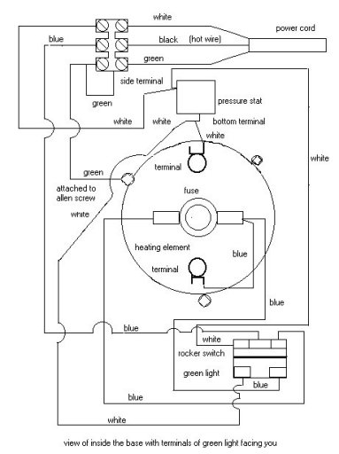 This is a rough schematic of the electrical circuit of my machine. Mfg. date Feb. 1996. 120 volt model. The low heat circuit are terminals A and C. The high heat circuit are terminals B and D.