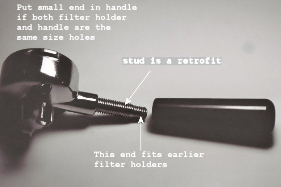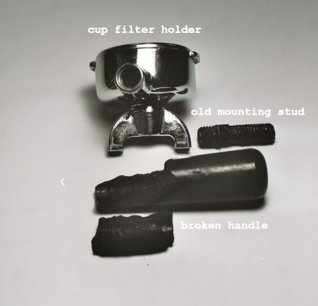 After 6 years my handle developed a crack. After another year went by, the handle needed to be replaced. After trying to unscrew the handle, it shattered on me. Handles either screw on or slip on the mounting stud. Newer machines screw on the stud. The stud was so corroded that it also needed to be replaced. My advice is to get the handle off and examine the stud. If you have a slip on handle you will probably have to retrofit to the screw on handle. If the stud needs to be replaced try to remove the stud from the cup filter holder. This may be difficult since years of getting it wet from washing has probably caused it to rust. Use some rust removing solution on the stud where it goes in the handle. Squirt it between the stud and cup filter hole. Leave it soak for a day and then use some Vise-Grips® on the protruding end and put the cup filter holder in a vise. Turn counterclockwise and try to remove the stud. If you can remove it, great! If not, you will probably have to order a new cup filter holder, stud, and handle. Explain to the Pavoni dealer your situation and see if the new cup filter holder will fit your Group. If you successfully removed the old stud, order a new stud and handle. The new stud will have one small threaded end and a larger threaded end. Older cup filter holders will accept the smaller end and the larger end screws into the handle. On the newer cup filter holders the hole in the cup holder and the hole in the handle are the same size. Screw the larger end stud into the cup filter holder and the smaller end goes into the handle. There is enough space in the handle to accept the smaller end while letting the larger threads engage the threads in the handle. The fit was kind of sloppy so I took some Teflon tape, that is used in plumbing applications, and wound of couple of turns of tape around the stud. I hope to protect the stud from rust by using the tape. The stud is expensive. If I had to do it all over, I would go to a good fastener store and buy a stainless steel metric hex bolt. Cut the bolt to length, bevel the edges, and use that as a mounting stud.