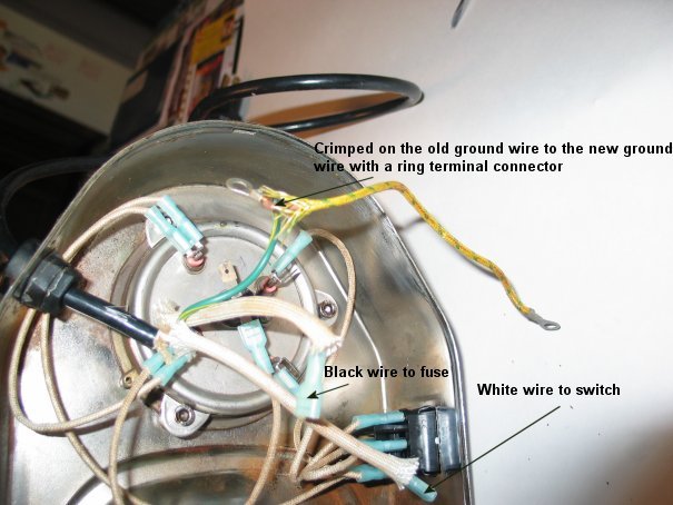 Check the power cord, it may be bad. The machine should be unplugged, and the leads of the power cord disconnected from inside the machine. Note where the inside leads are connected. Your wiring may be different than mine so note where your wires are connected inside the base. Put one lead from the tester to one of the disconnected leads, and touch one prong on the plug. Then touch the other prongs, respectively. You should get a reading only when one of the prongs is touched. Try the test on the other disconnected leads. If you get more than one reading when alternating from prong to prong, on a one lead test, there is a short in the cord, and the power cord needs replaced. Starting at one end of the cord and working down, slightly wiggle the cord. You may need another person to do this test, if you didn't get alligator clips with the multi-tester. You do this in case there is a short in the cord, and it takes a little movement for the wires to touch inside. If you get no reading at all from testing any of the prongs, the cord is bad. If the power cord checks out to be O.K. then probably it is the switch that is bad and you can skip down to the next paragraph. If you find the cord is bad, don't buy a Pavoni cord unless you have a lot of money in the bank! The last time I checked the price was $60. I used an old power cord from a IBM printer. Buy a power cord for a computer power supply for the replacement. The original power cord that was on my Pavoni was rated 18-3 SJT. This means the cord has three wires, hot, neutral, and ground. The wires are 18 gauge stranded copper and has a thermoplastic outer jacket. There is really nothing really special about the cord. A power cord for the power supply on a computer will be more than enough to handle the requirements of your Pavoni. The heating element draws about 8 AMPS and the power cord mentioned above is good for 10 AMPS. You could go to a 16 gauge cord, anything more would be overkill. One thing to check is the outside diameter of the cord. It has to go through the grommet on the side of the machine. The replacement cord I chose fit perfectly through the grommet hole. It's o.k. to be a little small on the cord diameter but you want to make sure the cord will fit the grommet hole. To replace the bad cord, disconnect the three leads from inside the machine. They probably would be disconnected anyway since you did this test. Cut off the terminals of the bad cord and pull the cord out of the machine. Once you get your new cord, cut off the connector opposite the plug. Thread the leads of the new cord through the grommet in the side of the machine. Use your old cord as a guide on how much outer insulation to strip off. Now using your crimping tool, crimp on some insulated terminals on the black and white wire. My Pavoni had a long ground wire that was attached to two places in the machine. It was still good and I wanted to use it with the new power cord. It saved me crimping on one more ring terminal along with new wire to use as the ground. Cut off the ground wire from the old cord and crimp that to an uninsulated ring terminal along with the ground wire of the new power cord. Since the wires on the new power cord had no insulation for heat, I used some fiberglass sleeving on the new wires to protect them from the heat of the heating element. You could wrap some electrical tape around the power cord insulation where the cord comes through the grommet. This may provide some strain relief on the cord if you happen to pull on the cord from outside the base. It's a little work to make up a new cord but it sure beats paying $60! Look in REMAINING CHECKS below to see how to use a wire crimper if you don't know how they work.