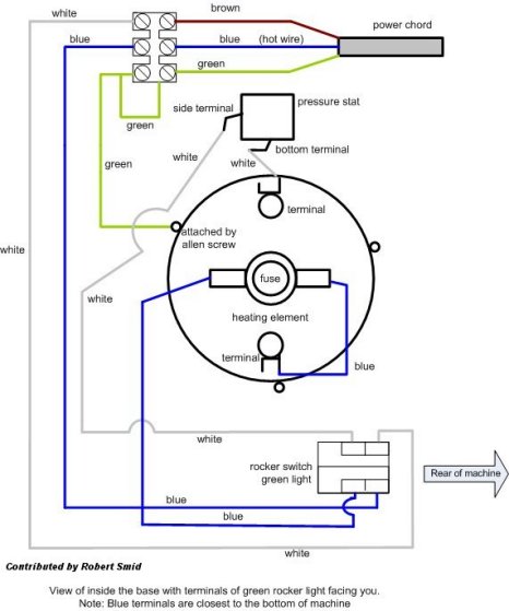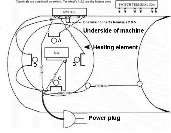 This is a rough schematic of the electrical circuit of my machine. Mfg. date Feb. 1996. 120 volt model. The low heat circuit are terminals A and C. The high heat circuit are terminals B and D.