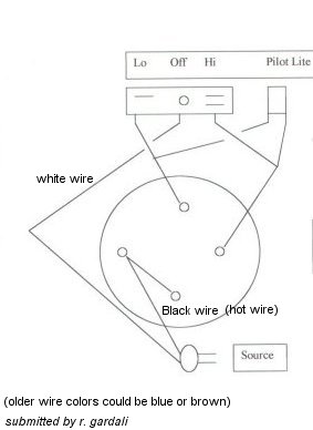 This is a rough wiring schematic of an older Pavoni with a three position switch (Lo/Off/HI) and pilot light. If you don't have a light, disregard the wires going to the light.